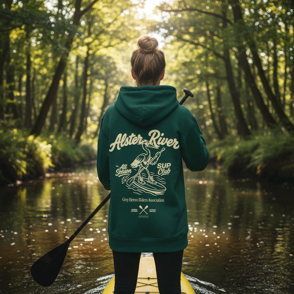 Der Alster River All Seasons SUP Club Hoodie ist für die, die Hamburgs Wasserader lieben, egal bei welchem Wetter. Ob beim Stand-Up-Paddeln im Sonnenaufgang, beim Spaziergang am Ufer im Nebel oder im Café mit Blick aufs Wasser: Sein zeitloses Design und die robuste Eleganz machen ihn zum Lieblingsstück für alle Jahreszeiten.