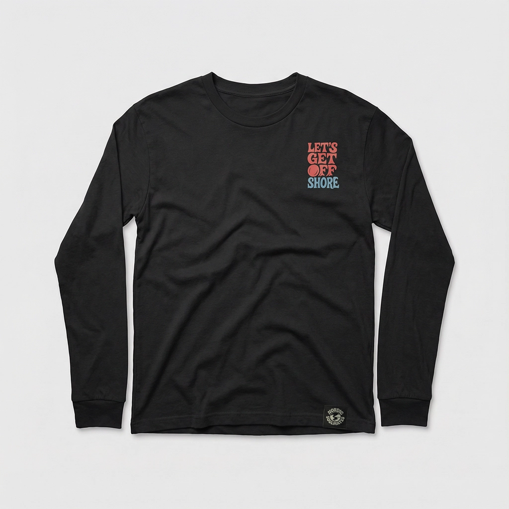 <img src="lets-get-offshore-longsleeve-black-close-up-meer-strand-rueckansicht.jpg" alt="Close-Up eines Mannes von hinten im 'Let’s Get Offshore' Longsleeve in Black: Blick auf das Meer an einem Strand mit schwarzem Wasser, großer Backprint mit nordischer Landschaft und Surfer-Symbolik, gefertigt aus 100% GOTS-zertifizierter Bio-Baumwolle">