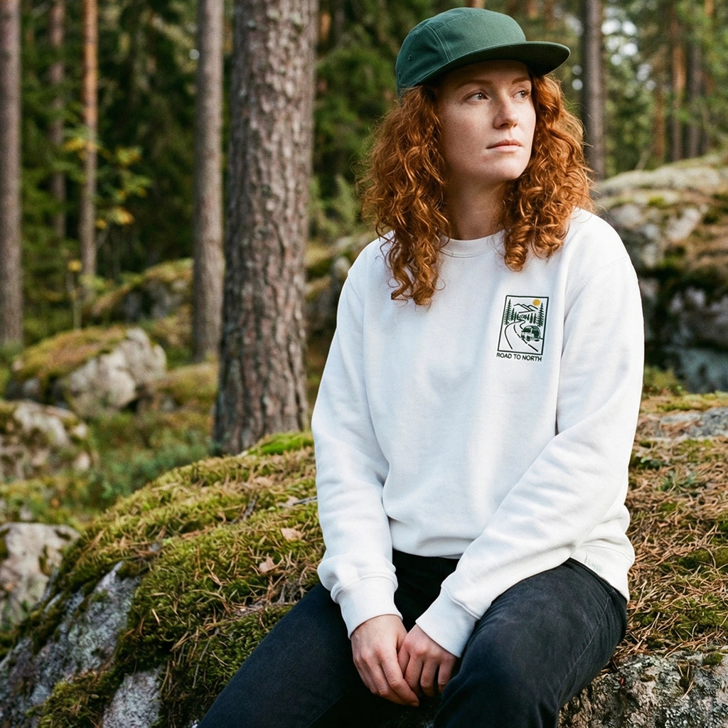 Unser Road to North Sweater – gefertigt aus 100 % GOTS-zertifizierter Bio-Baumwolle. Trage nicht nur Stoff, sondern die Stille skandinavischer Wälder, die Kälte klarer Nächte und den unendlichen Horizont des Nordens.