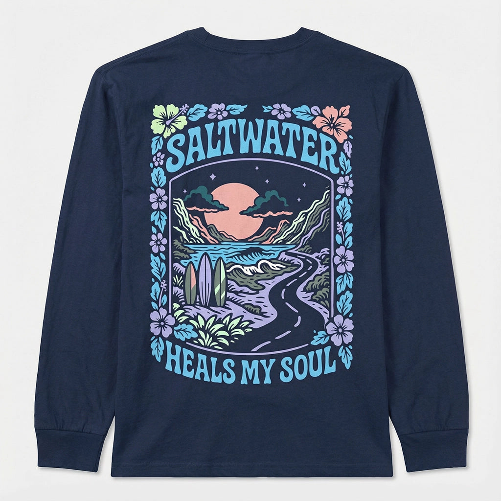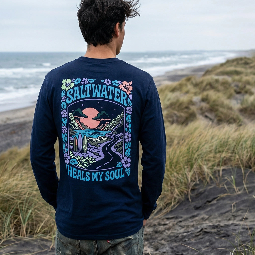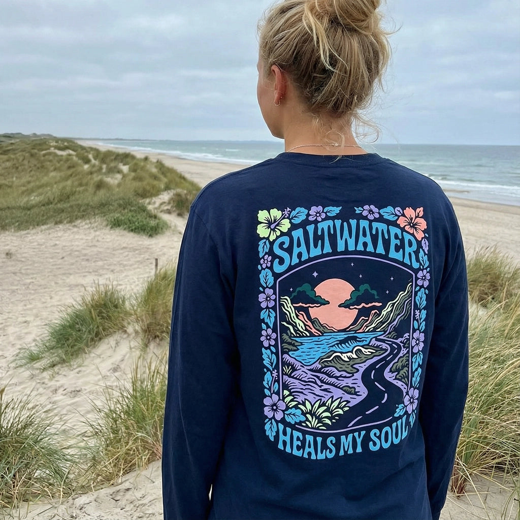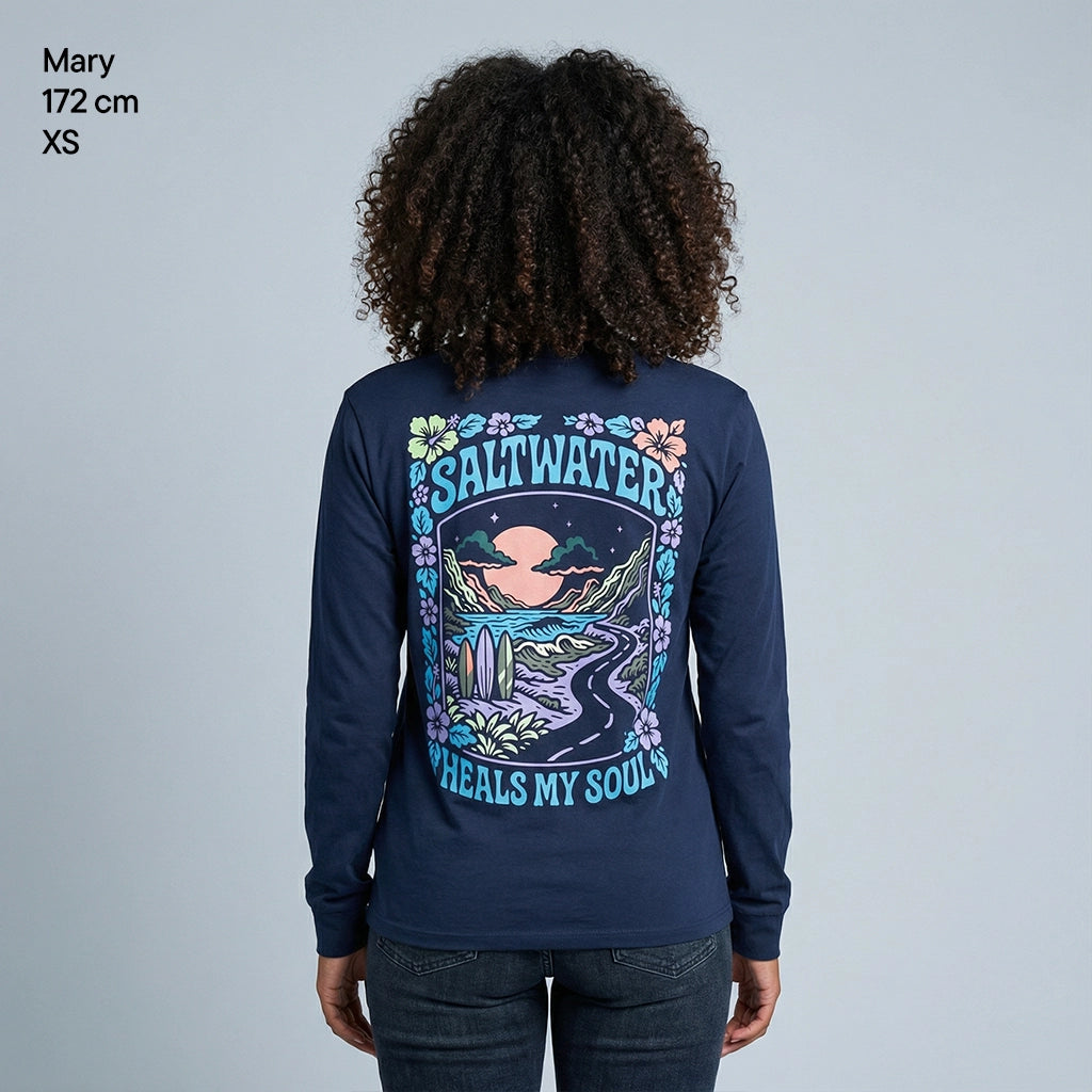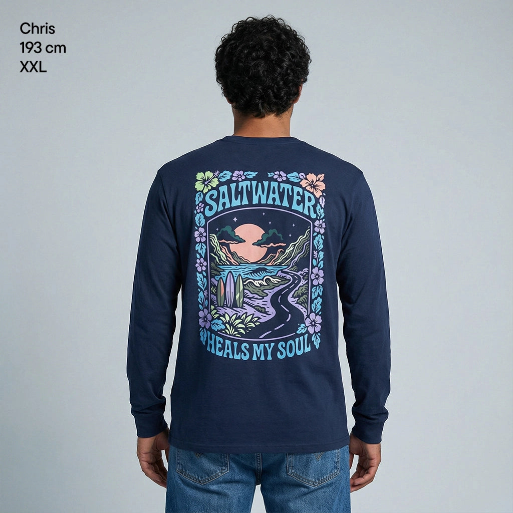 Das Saltwater Heals my Soul Langarm-Shirt ist wie das Meer selbst wild, frei und heilend. Ob nach einer Session im kalten Wasser, beim Lagerfeuer mit Blick auf die Wellen oder einfach so, wenn die Seele nach Weite schreit: Der auffälliger Print und der lässige Tragekomfort machen es zum Begleiter für alle, die im Salzwasser ihre Balance finden.