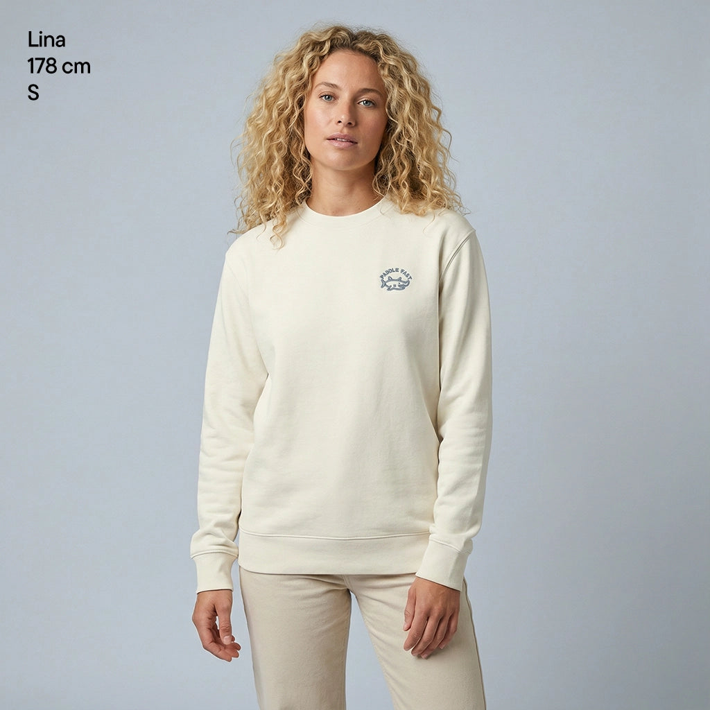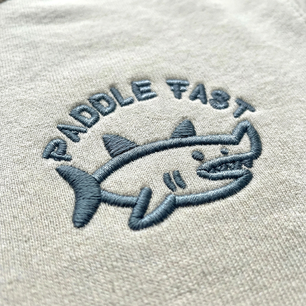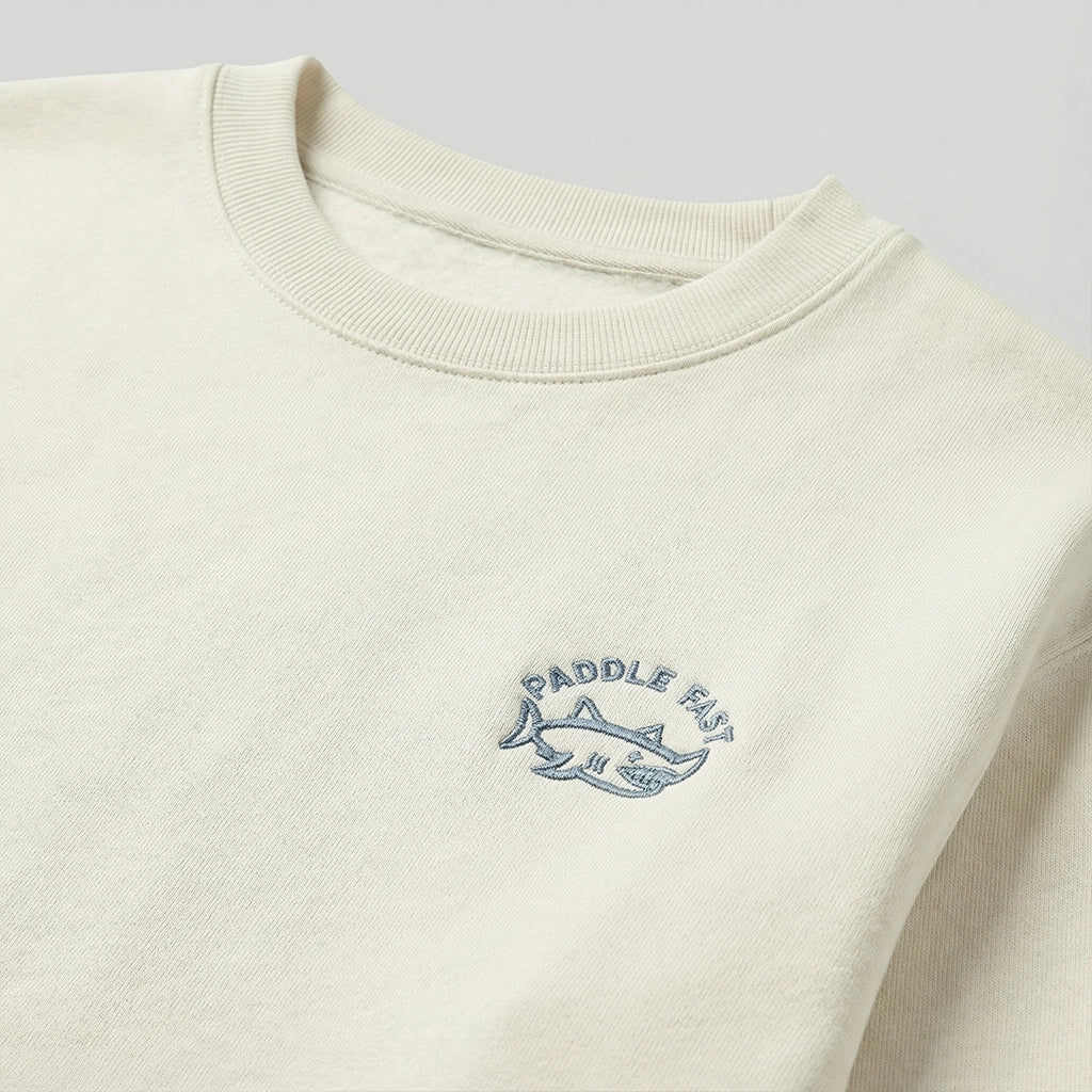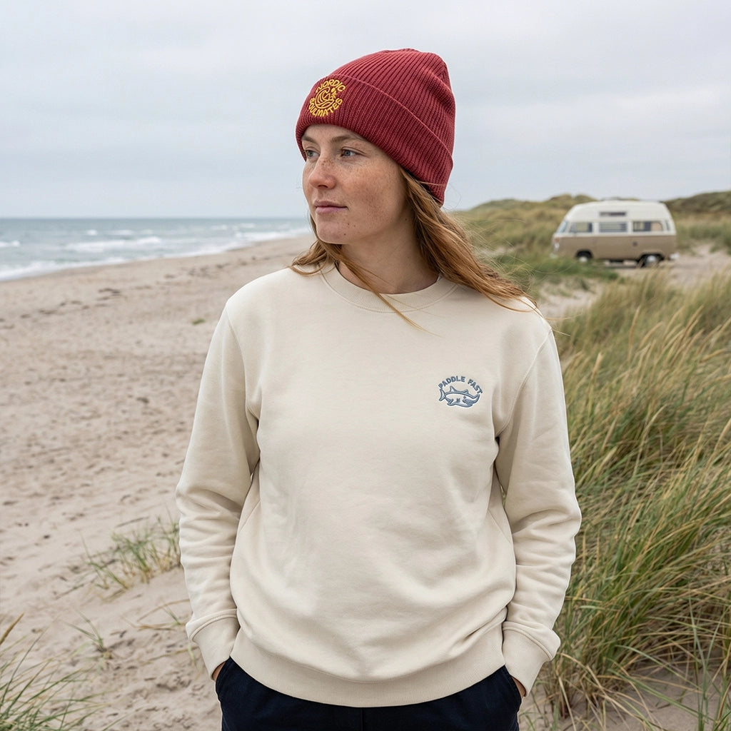 Freiheit tragen, Natur spüren. Das „Paddle Fast“ Crewneck Sweatshirt in Natural Raw ist dein perfekter Begleiter für Surf-Sessions am Meer, gemütliche Abende im Van oder entspannte Momente in der Natur. Mit seinem dezenten Hai-Stick auf der linken Brust verkörpert es den Spirit von Abenteuer und Respekt vor dem Ozean.