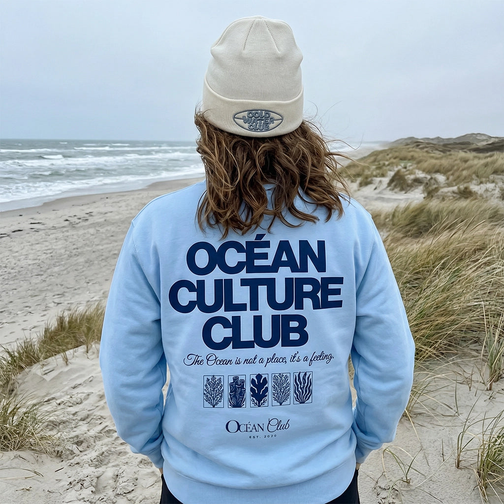 Salzige Luft, weite Horizonte, das Rauschen der Wellen – das Ocean Culture Club Sweatshirt fängt die Essenz des Meeres ein. Sein hochwertiger Print ein typografisches Statement untermalt von Algen, Korallen und Wasserpflanzen, ist keine Dekoration, sondern eine Erinnerung: an die Stille unter der Oberfläche. An die Kraft, die im Verborgenen wächst. An die Tage, an denen das Meer ruft und du einfach gehst.