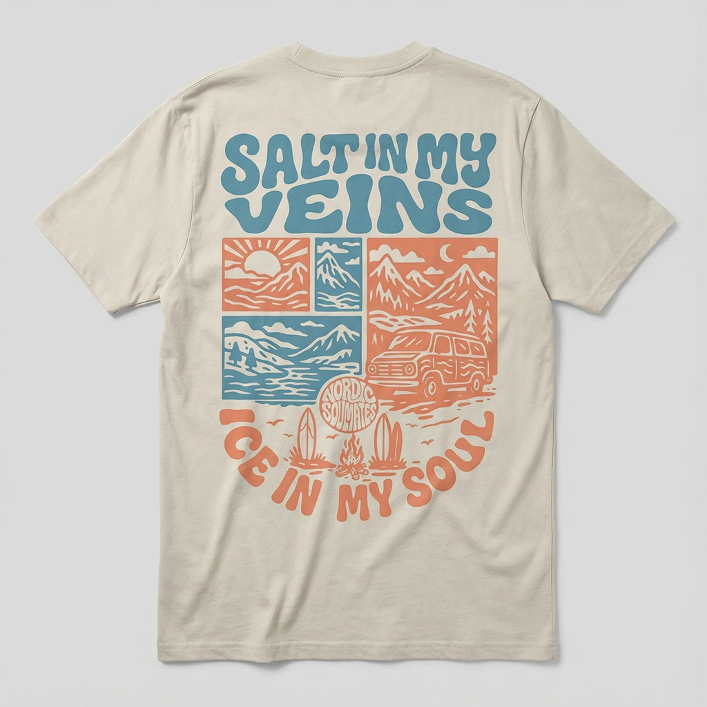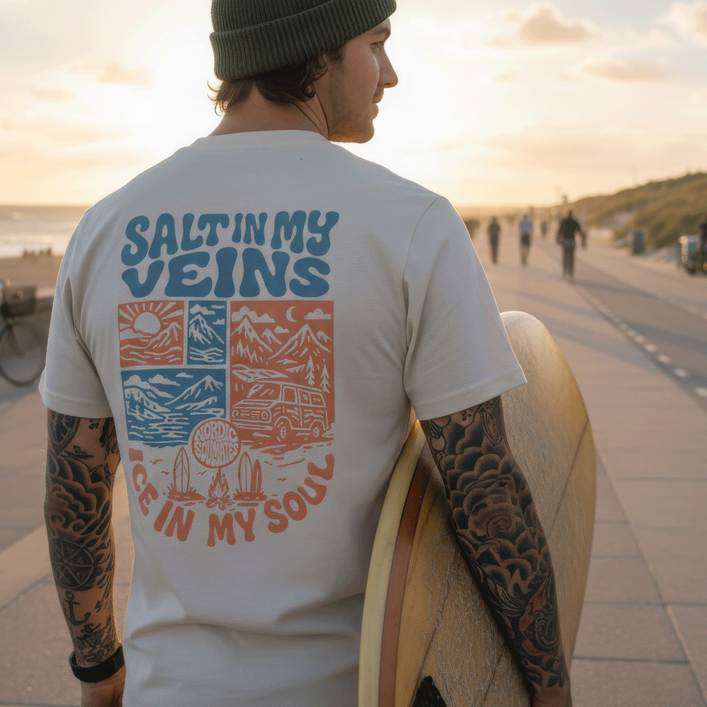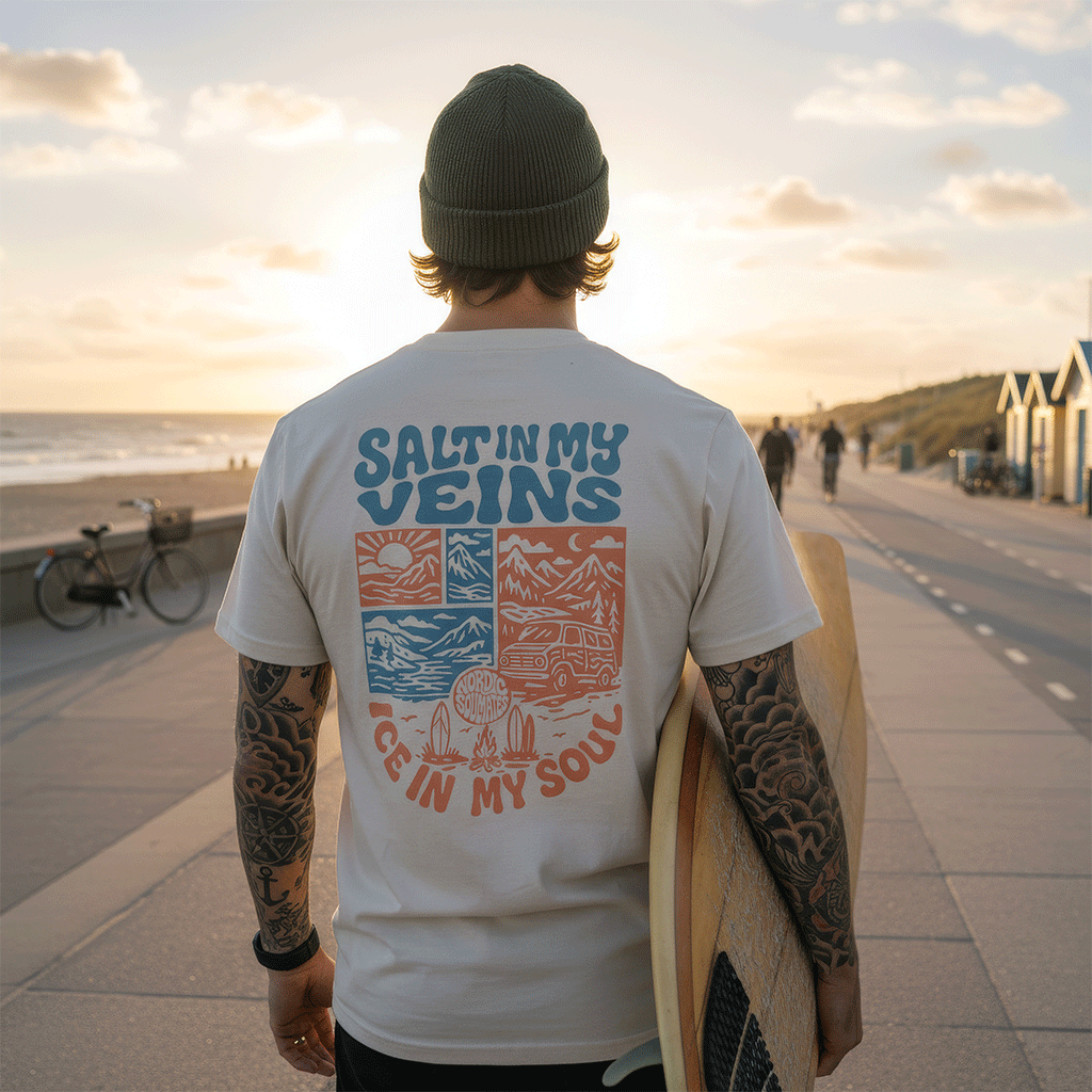 Unser Salty Veins T-Shirt ist ein Statement für alle, die das Meer atmen, die Berge spüren und im Van die Welt entdecken. Mit dem markanten Backprint wird es zum Begleiter für Abenteuer, Freiheit und nordischen Spirit.